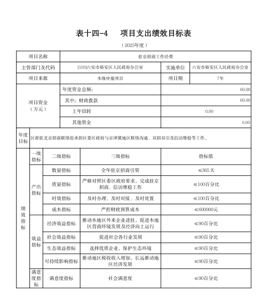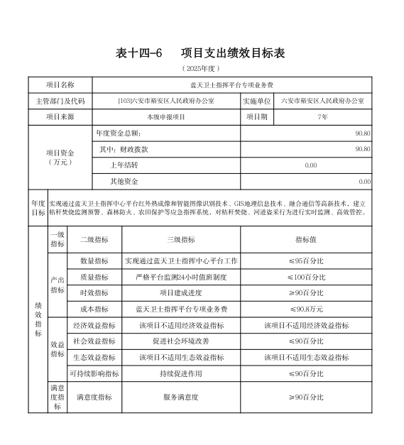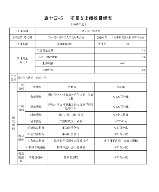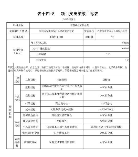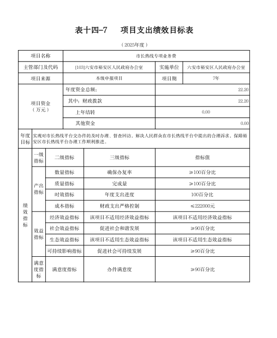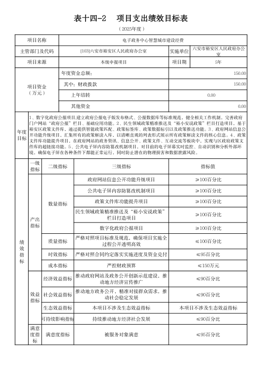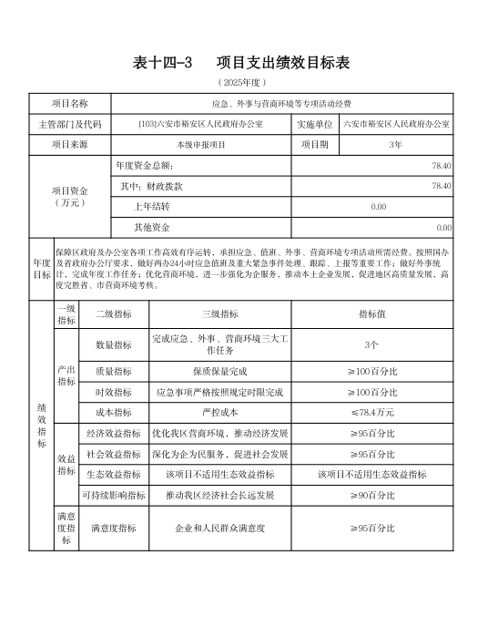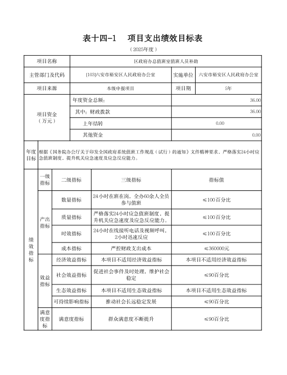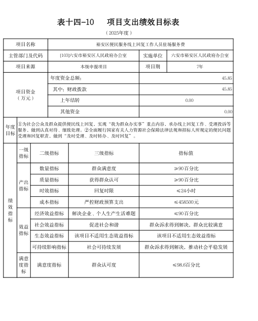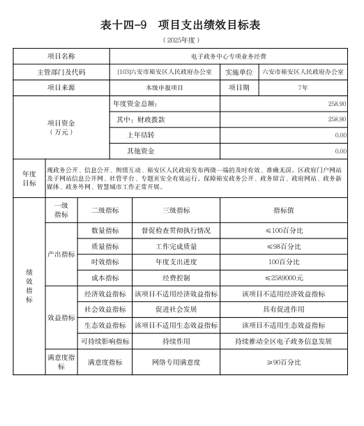 六安市裕安区德赢VWIN办公室2025年项目支出绩效目标表