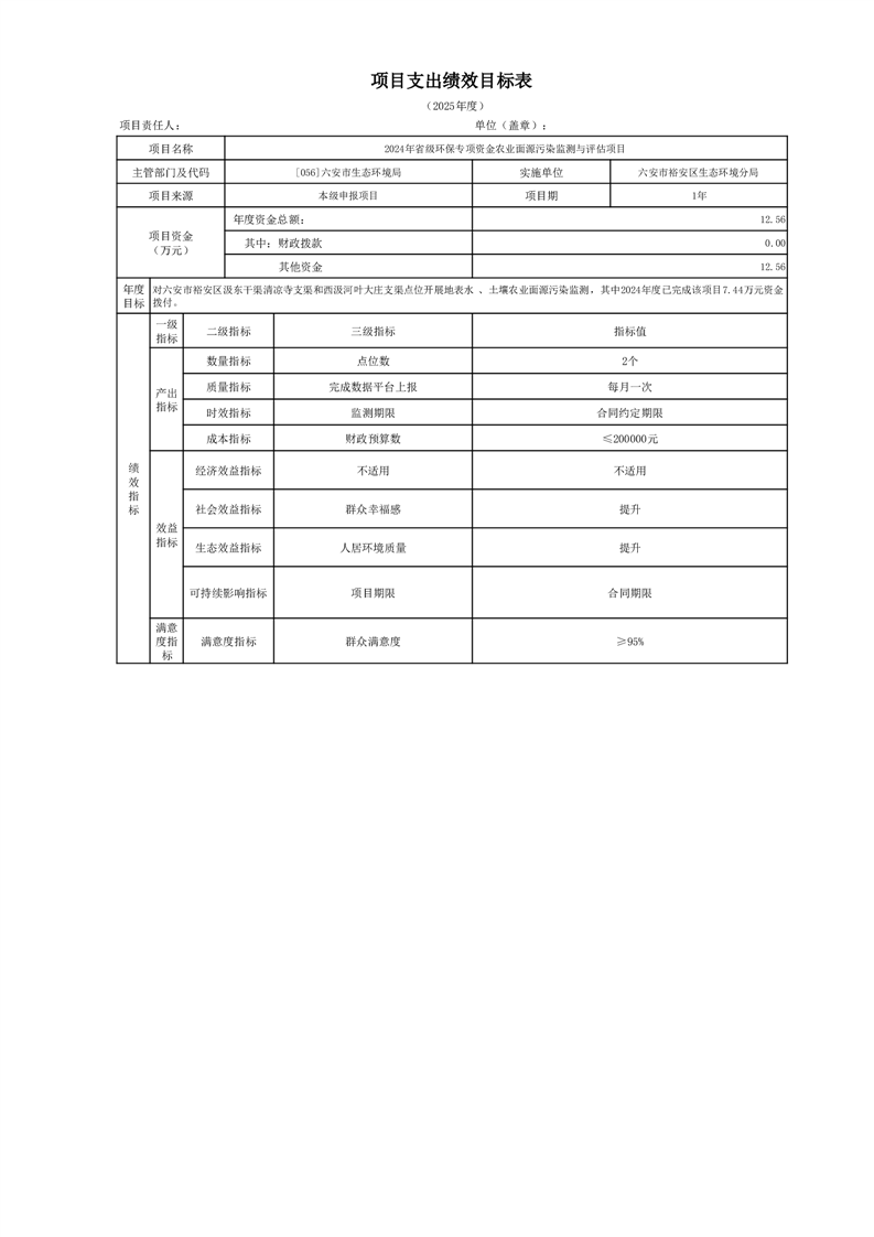 六安市裕安区生态环境分局2025年“2024年省级环保专项资金农业面源污染监测与评估项目”项目支出预算绩效目标表