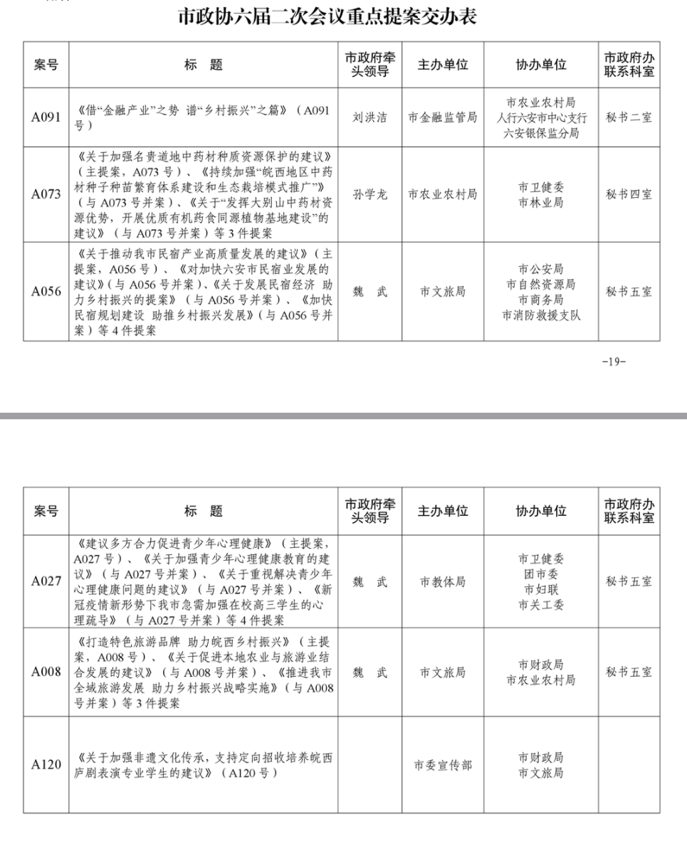 六安市政协六届二次会议重点提案交办表(不涉及裕安区)