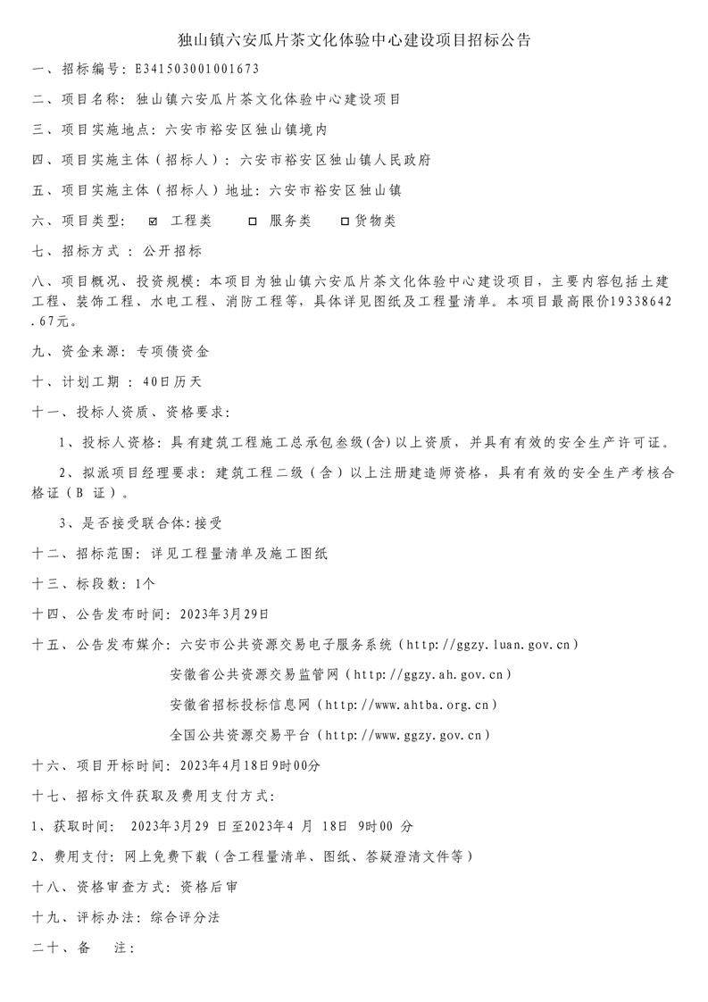 独山镇六安瓜片茶文化体验中心建设项目招标公告