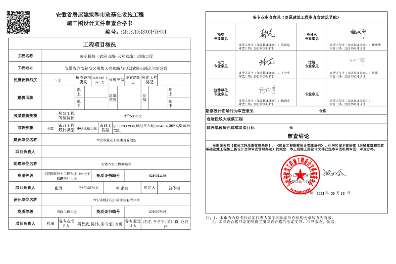黄小桥路(武陟山路-天堂寨路)道路工程施工图文件审查意见书