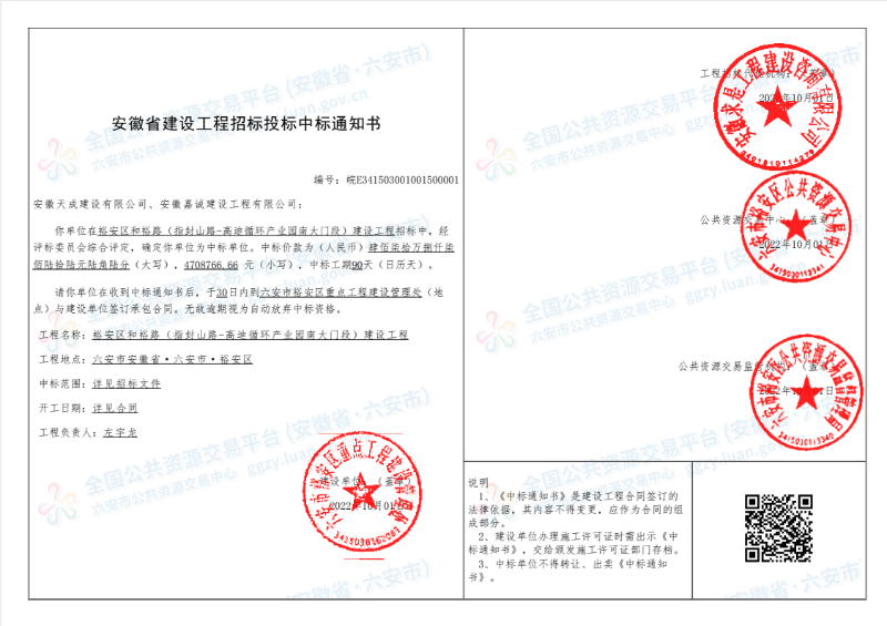 和裕路(指封山路-高迪循环产业园南大门段)建设工程中标通知书