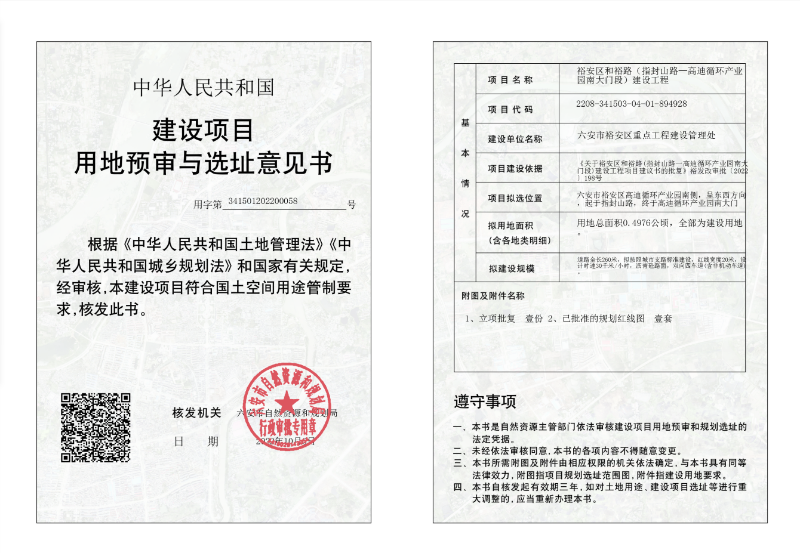 和裕路(指封山路-高迪循环产业园南大门段)建设项目用地预审与选址意见书