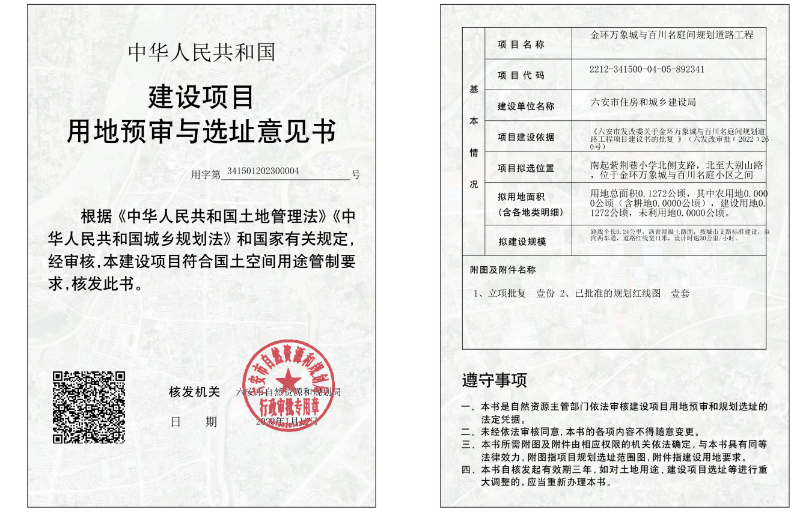 金环万象城与百川名庭间规划道路工程建设项目用地预审与选址意见书