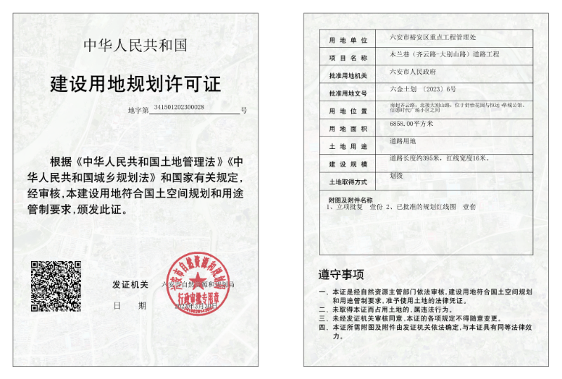 木兰巷(齐云路~大别山路)道路工程建设用地规划许可证