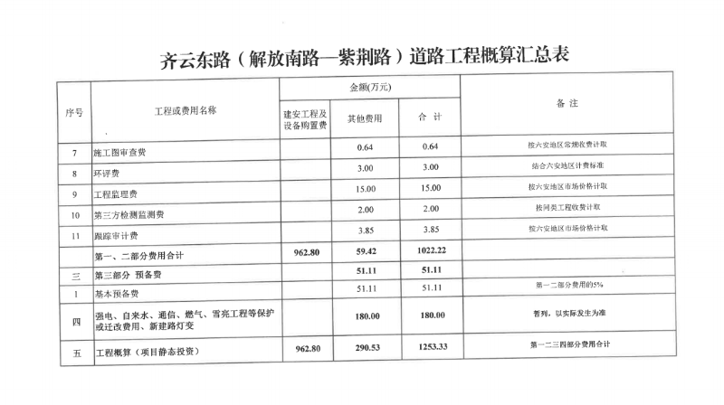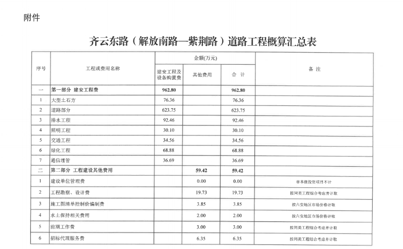 附件:齐云东路(解放南路—紫荆路)道路工程概算汇总表
