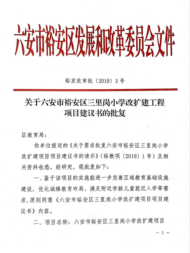 关于三里岗小学改扩建工程项目建议书的批复