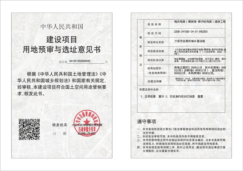 响洪甸路(翠屏路—佛子岭西路)道路工程用地预审与选址意见书