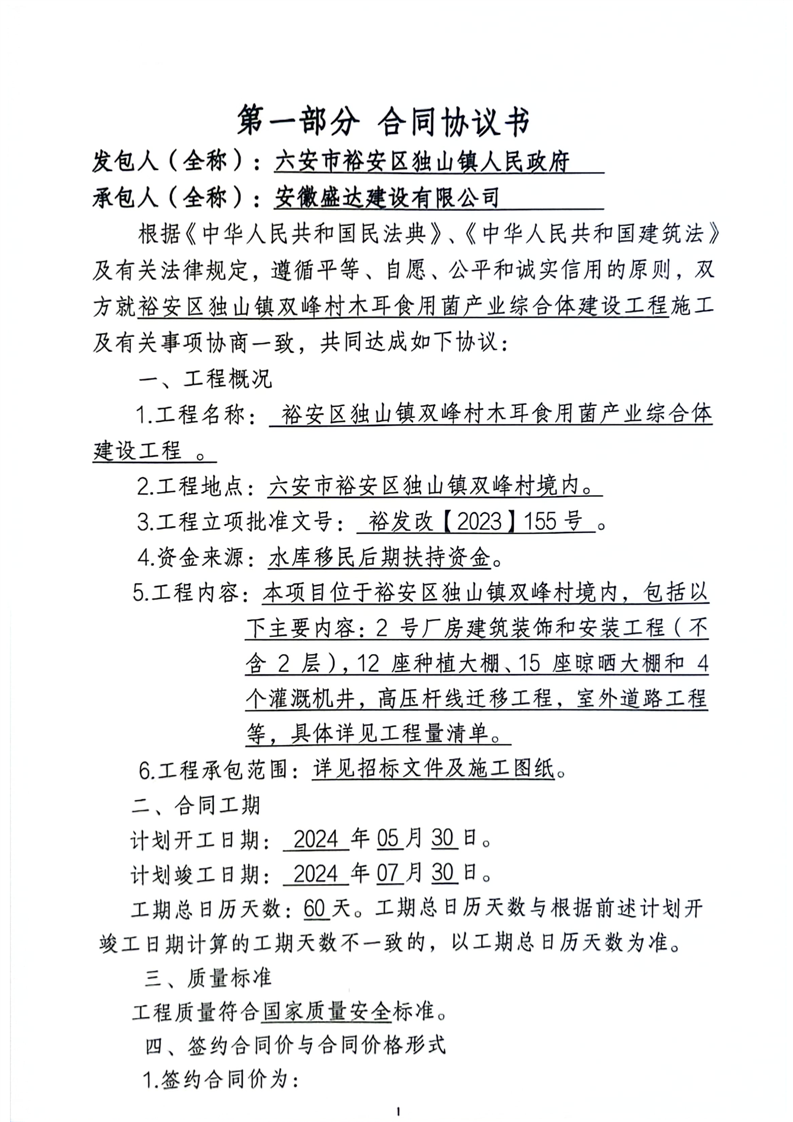 裕安区独山镇双峰村木耳食用菌产业综合体建设工程施工合同