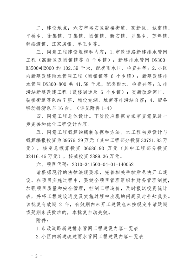 裕安区排水防涝能力提升项目初步设计与概算的批复