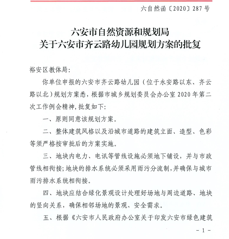 六安市自然资源和规划局关于六安市齐云路幼儿园规划方案的批复
