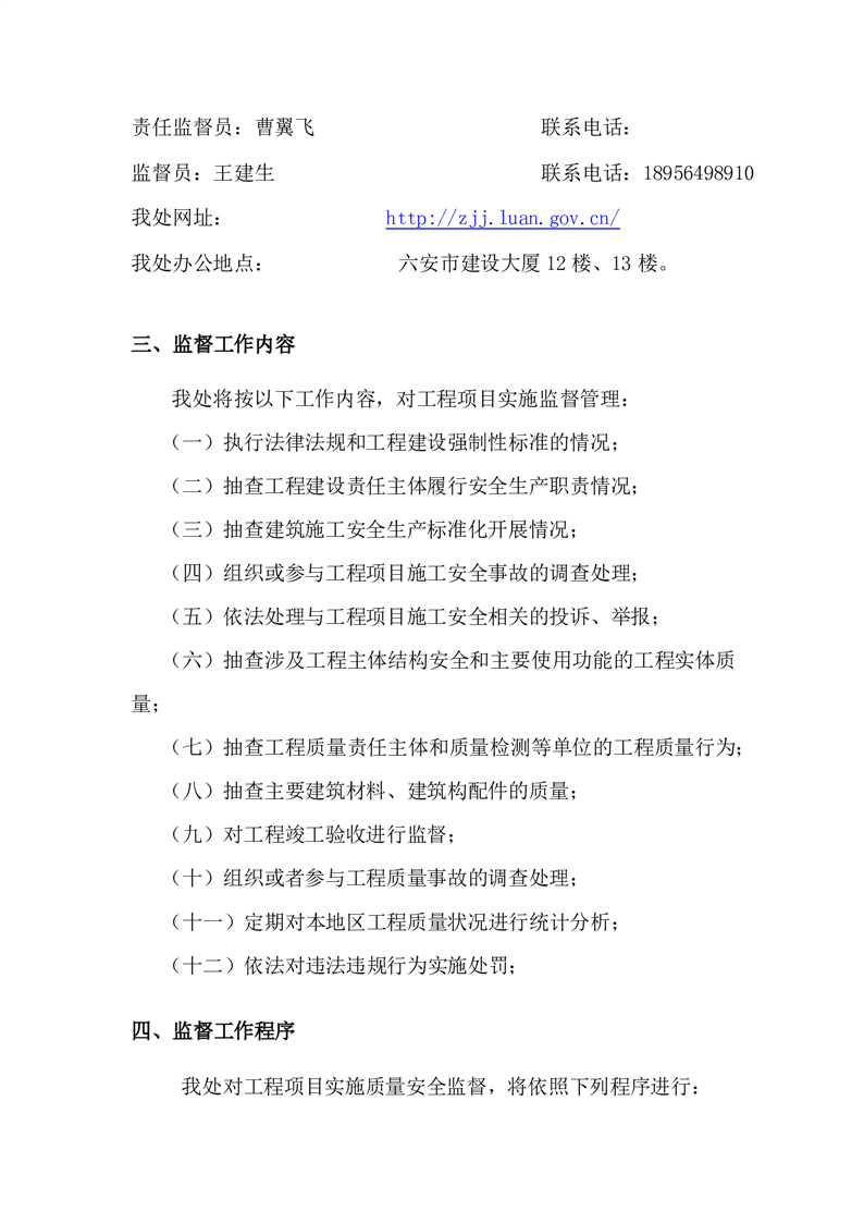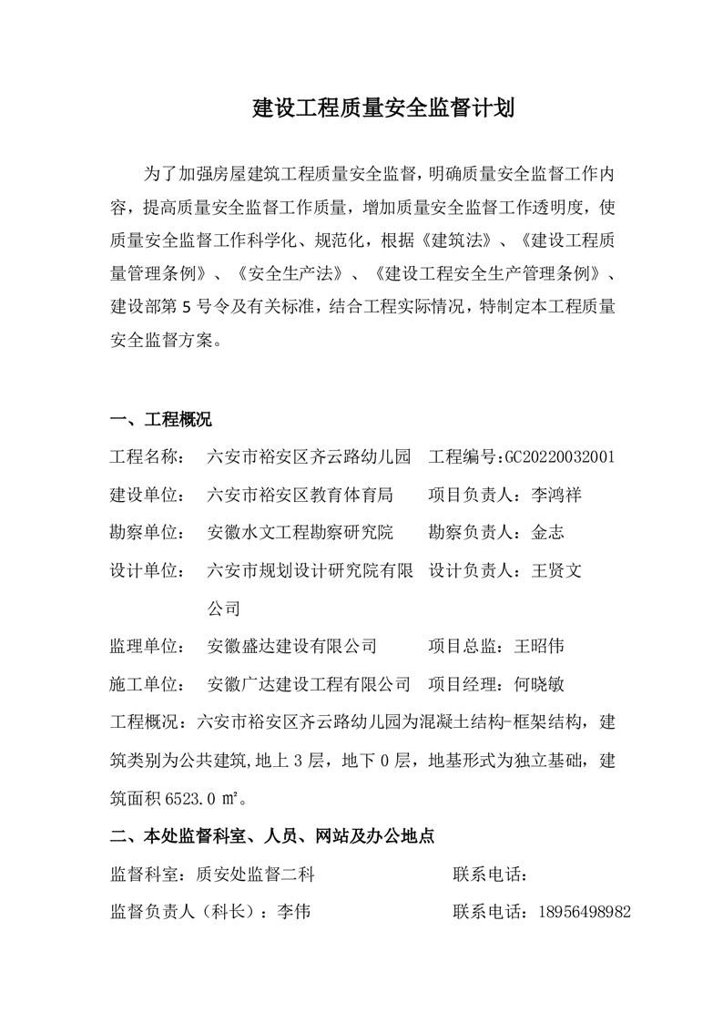 裕安区齐云路幼儿园建设工程质量安全监督计划