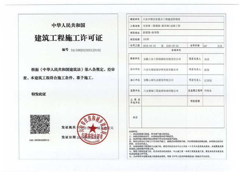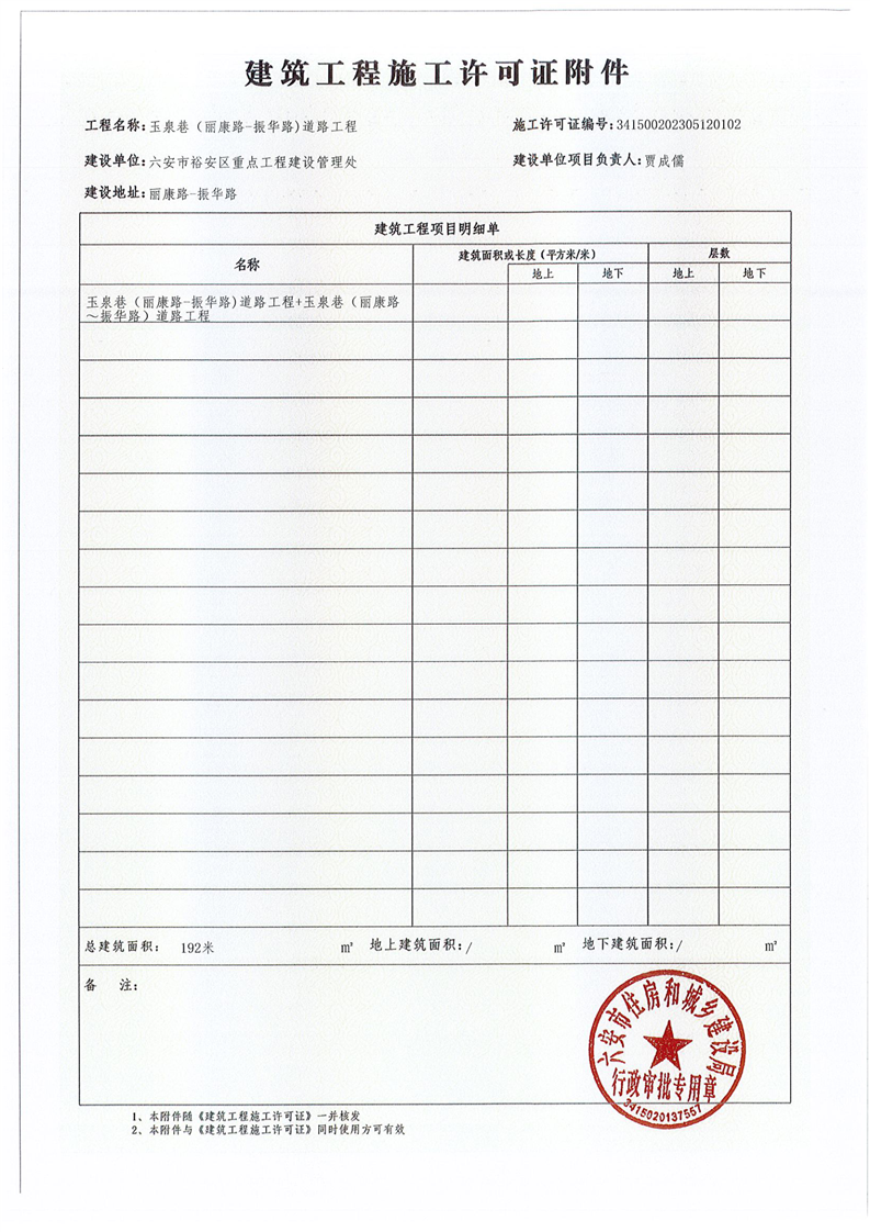 玉泉巷(丽康路-振华路)道路工程建筑工程施工许可证