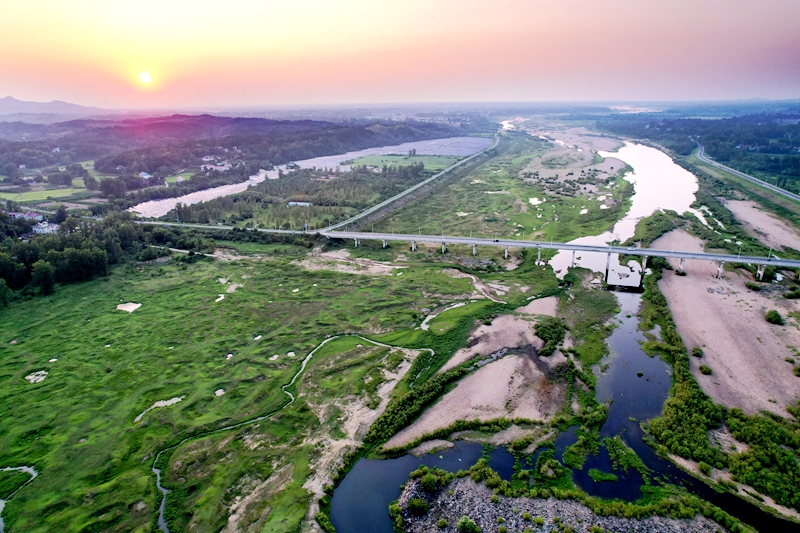 盛夏时节,六安市裕安区横排头景区湿地水清草绿,树木葱茏,牛羊成群,生态优美动人。