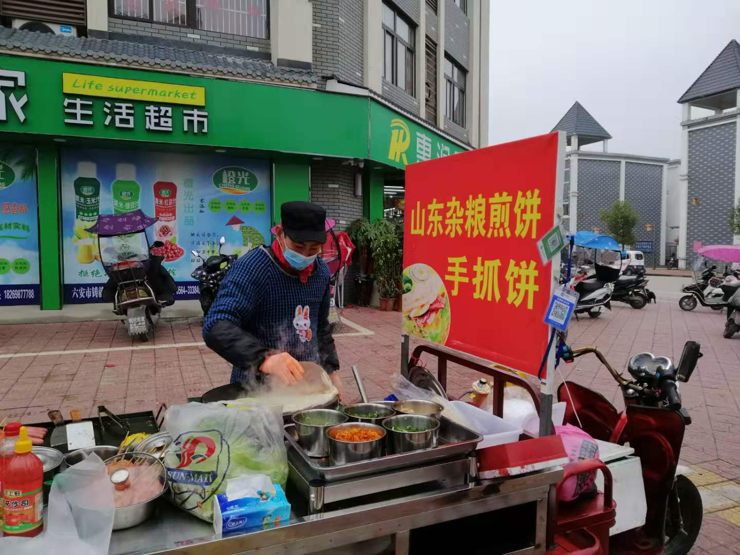 2020年10月1日开始,身体好转的杨继刚没有闲着,他想着党和国家的政策好,自己更要自强不息,要靠自己的双手实现真正脱贫。于是,在镇扶贫站的安排下他报名学习了小吃技术,并在韩摆渡镇马家庵街道华联超市门口摆了一个移动摊位,经营“山东杂粮煎饼、手抓饼”。因为生意刚刚起步,每天的营业额在100元左右,利润在50元左右,虽然收入不高,但杨继刚却很满足,他说:“要不是党和政府的帮助,我早就倒下了,现在我靠自己的双手做点力所能及的小生意,既不影响治疗恢复,也给女儿树立了一个榜样,我相信靠我一家人的努力,生活一定会越来越好的。”